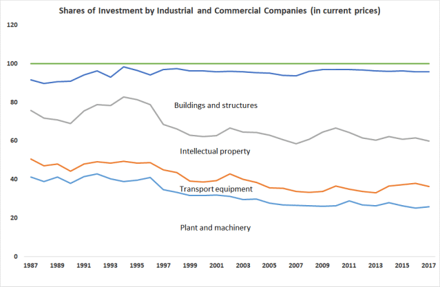 These policies have also led to a deterioration in the structure of investment. For example, in his 1997 Budget, Gordon Brown removed the ACT system that had until then provided investors with relief against double taxation of dividends (i.e. both at the level of the firm as profits and the level of the investor as dividend income). This reform was designed to encourage investment through retained profits. However, it left in place the relief on debt interest payments, which remained fully deductible from taxable profit. This anomaly favours debt at the expense of equity finance, encouraging excessive leverage, risk taking and the risk of default. It favours assets like commercial property that are easy to collateralize. Thus, it is not surprising to find that, within the declining share of investment relative to GDP, the share of buildings investment has increased markedly since 1997, while the share of investment in intellectual property and plant & machinery has declined